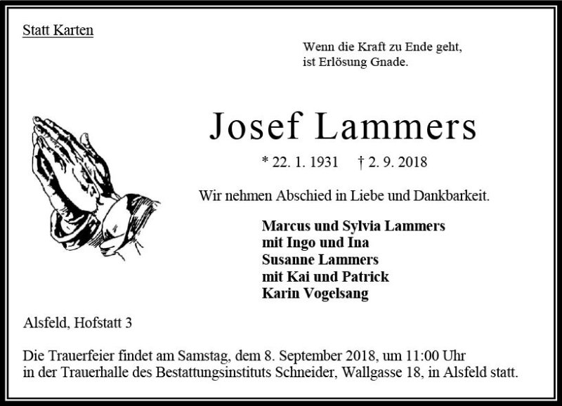 Hier finden Sie alle Traueranzeigen aus der Zeitung, die bisher für Josef Lammers erschienen sind. Weitere Traueranzeigen, die in der Zeitung erscheinen, werden hier ebenfalls aufgelistet