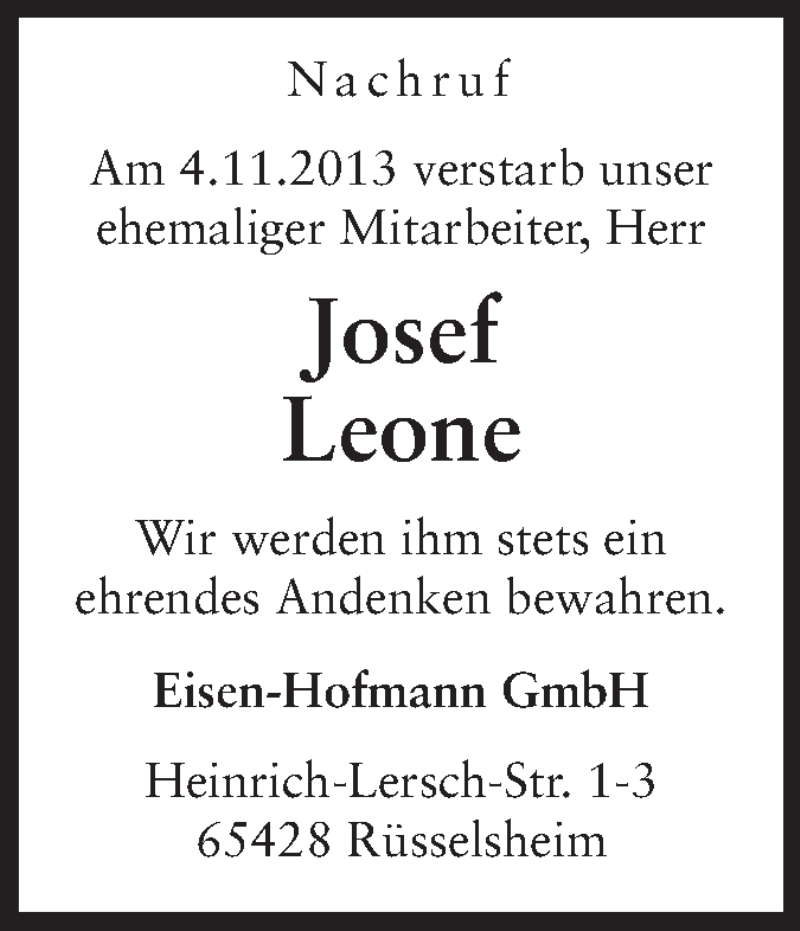 Hier finden Sie alle Traueranzeigen aus der Zeitung, die bisher für Josef Leone erschienen sind. Weitere Traueranzeigen, die in der Zeitung erscheinen, werden hier ebenfalls aufgelistet