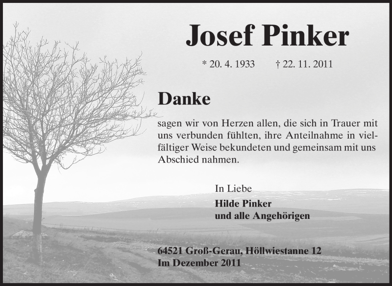 Hier finden Sie alle Traueranzeigen aus der Zeitung, die bisher für Josef Pinker erschienen sind. Weitere Traueranzeigen, die in der Zeitung erscheinen, werden hier ebenfalls aufgelistet