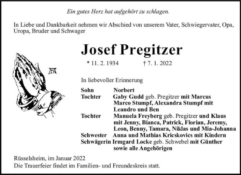 Hier finden Sie alle Traueranzeigen aus der Zeitung, die bisher für Josef Pregitzer erschienen sind. Weitere Traueranzeigen, die in der Zeitung erscheinen, werden hier ebenfalls aufgelistet