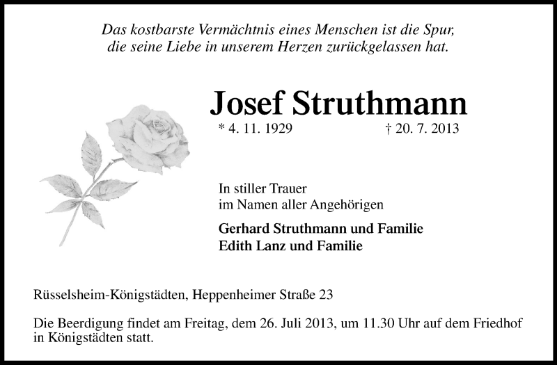 Hier finden Sie alle Traueranzeigen aus der Zeitung, die bisher für Josef Struthmann erschienen sind. Weitere Traueranzeigen, die in der Zeitung erscheinen, werden hier ebenfalls aufgelistet