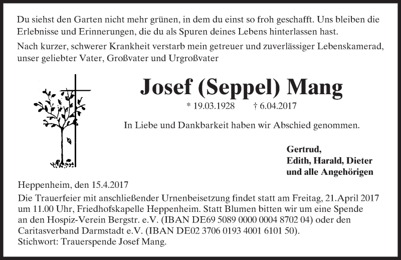 Hier finden Sie alle Traueranzeigen aus der Zeitung, die bisher für Josef Seppel Mang erschienen sind. Weitere Traueranzeigen, die in der Zeitung erscheinen, werden hier ebenfalls aufgelistet