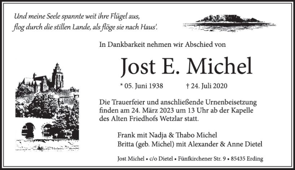 Hier finden Sie alle Traueranzeigen aus der Zeitung, die bisher für Jost E. Michel erschienen sind. Weitere Traueranzeigen, die in der Zeitung erscheinen, werden hier ebenfalls aufgelistet