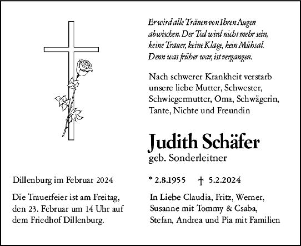 Hier finden Sie alle Traueranzeigen aus der Zeitung, die bisher für Judith Schäfer erschienen sind. Weitere Traueranzeigen, die in der Zeitung erscheinen, werden hier ebenfalls aufgelistet