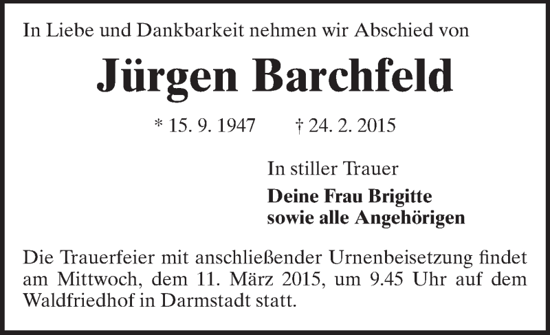 Hier finden Sie alle Traueranzeigen aus der Zeitung, die bisher für Jürgen Barchfeld erschienen sind. Weitere Traueranzeigen, die in der Zeitung erscheinen, werden hier ebenfalls aufgelistet