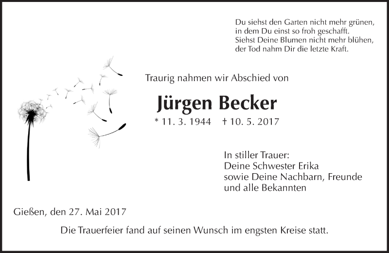 Hier finden Sie alle Traueranzeigen aus der Zeitung, die bisher für Jürgen Becker erschienen sind. Weitere Traueranzeigen, die in der Zeitung erscheinen, werden hier ebenfalls aufgelistet