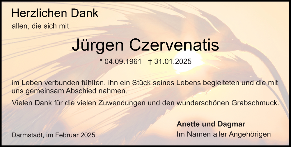 Hier finden Sie alle Traueranzeigen aus der Zeitung, die bisher für Jürgen Czervenatis erschienen sind. Weitere Traueranzeigen, die in der Zeitung erscheinen, werden hier ebenfalls aufgelistet
