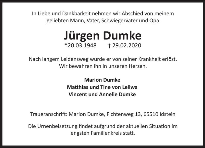 Hier finden Sie alle Traueranzeigen aus der Zeitung, die bisher für Jürgen Dumke erschienen sind. Weitere Traueranzeigen, die in der Zeitung erscheinen, werden hier ebenfalls aufgelistet