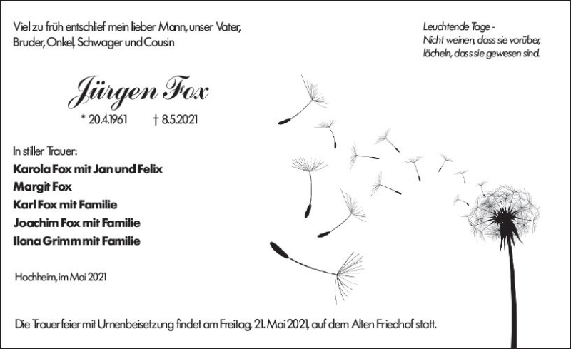 Hier finden Sie alle Traueranzeigen aus der Zeitung, die bisher für Jürgen Fox erschienen sind. Weitere Traueranzeigen, die in der Zeitung erscheinen, werden hier ebenfalls aufgelistet