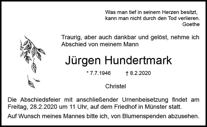 Hier finden Sie alle Traueranzeigen aus der Zeitung, die bisher für Jürgen Hundertmark erschienen sind. Weitere Traueranzeigen, die in der Zeitung erscheinen, werden hier ebenfalls aufgelistet