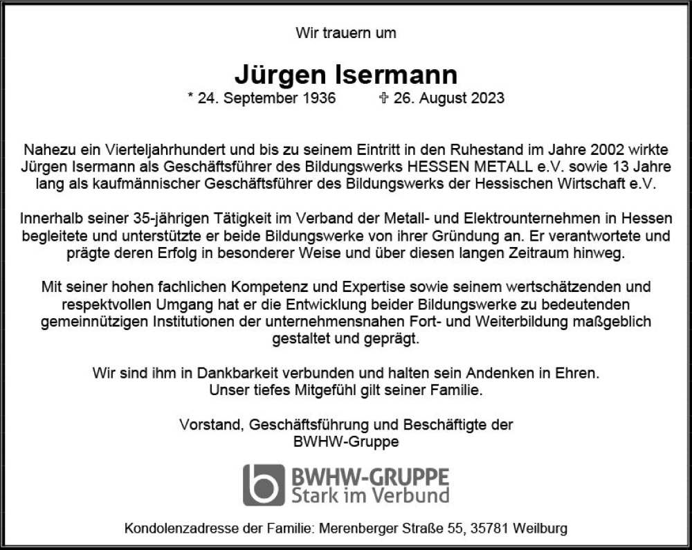 Hier finden Sie alle Traueranzeigen aus der Zeitung, die bisher für Jürgen Isermann erschienen sind. Weitere Traueranzeigen, die in der Zeitung erscheinen, werden hier ebenfalls aufgelistet