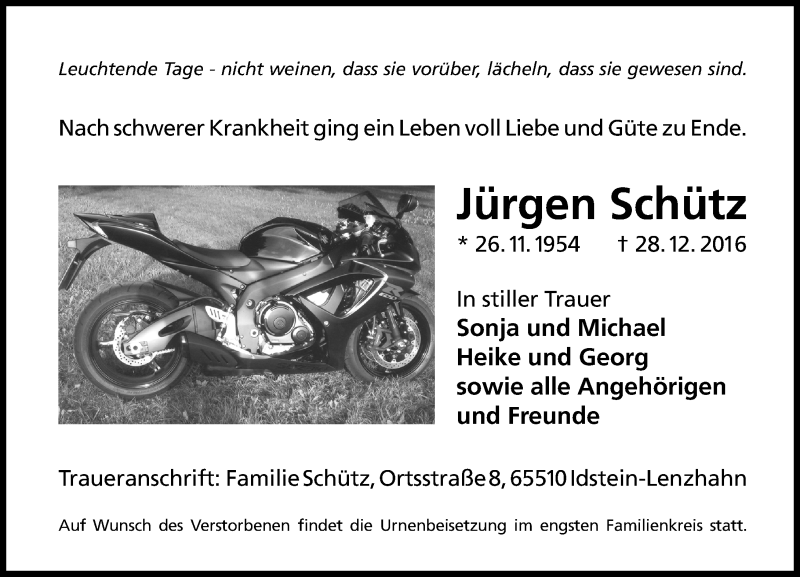 Hier finden Sie alle Traueranzeigen aus der Zeitung, die bisher für Jürgen Schütz erschienen sind. Weitere Traueranzeigen, die in der Zeitung erscheinen, werden hier ebenfalls aufgelistet