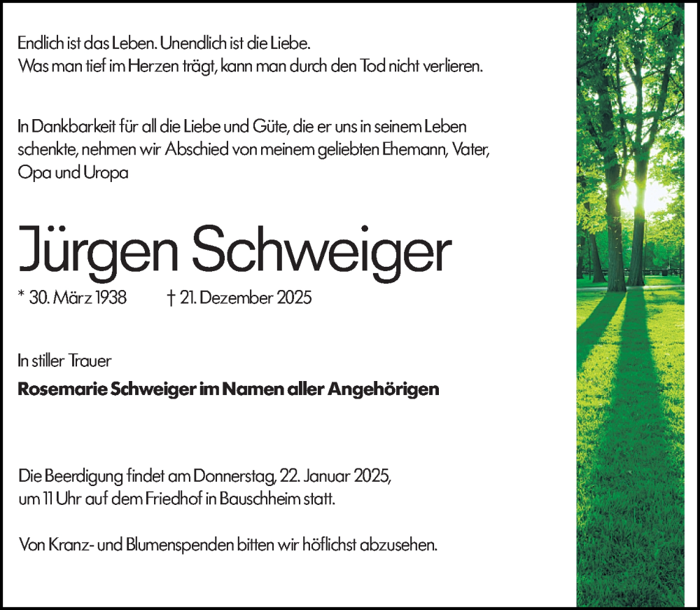 Hier finden Sie alle Traueranzeigen aus der Zeitung, die bisher für Jürgen Schweiger erschienen sind. Weitere Traueranzeigen, die in der Zeitung erscheinen, werden hier ebenfalls aufgelistet
