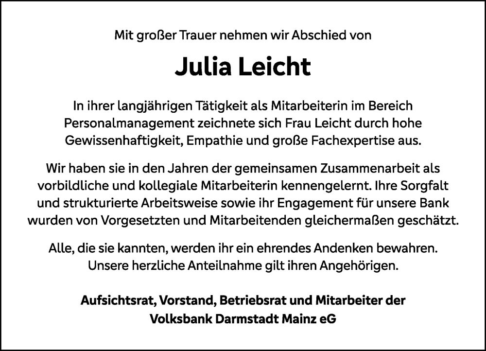Hier finden Sie alle Traueranzeigen aus der Zeitung, die bisher für Julia Leicht erschienen sind. Weitere Traueranzeigen, die in der Zeitung erscheinen, werden hier ebenfalls aufgelistet