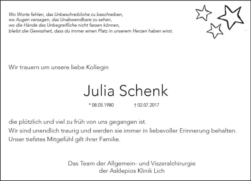 Hier finden Sie alle Traueranzeigen aus der Zeitung, die bisher für Julia Schenk erschienen sind. Weitere Traueranzeigen, die in der Zeitung erscheinen, werden hier ebenfalls aufgelistet