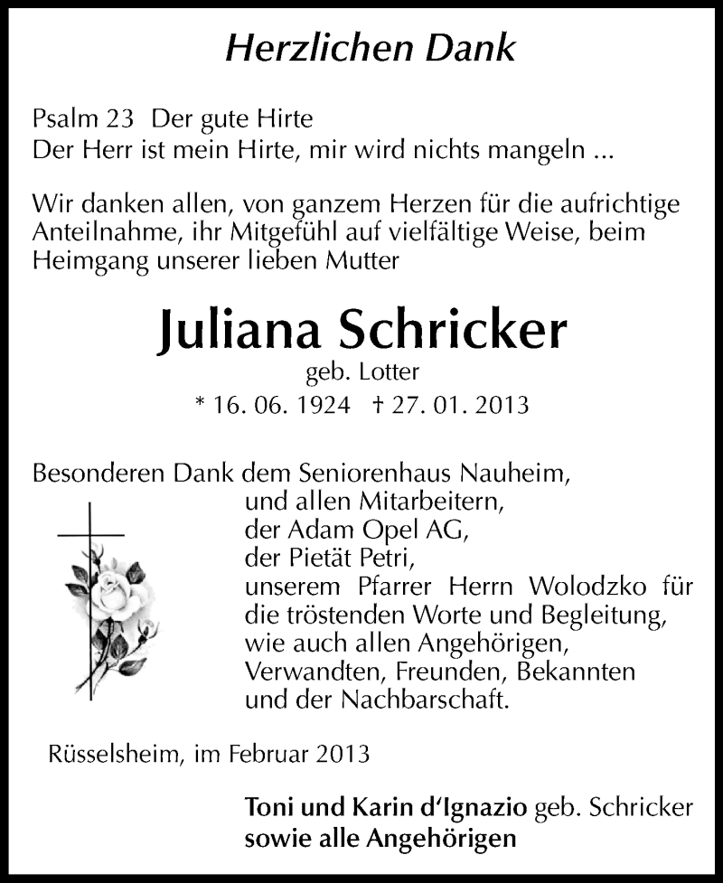Hier finden Sie alle Traueranzeigen aus der Zeitung, die bisher für Juliana Schricker erschienen sind. Weitere Traueranzeigen, die in der Zeitung erscheinen, werden hier ebenfalls aufgelistet