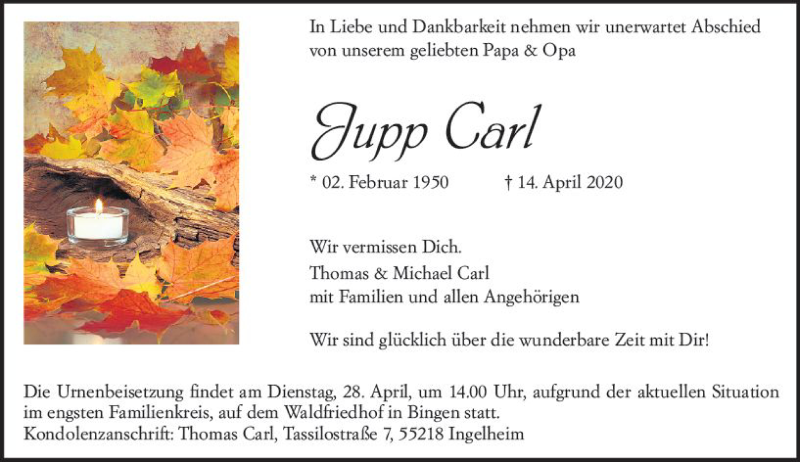 Hier finden Sie alle Traueranzeigen aus der Zeitung, die bisher für Jupp Carl erschienen sind. Weitere Traueranzeigen, die in der Zeitung erscheinen, werden hier ebenfalls aufgelistet