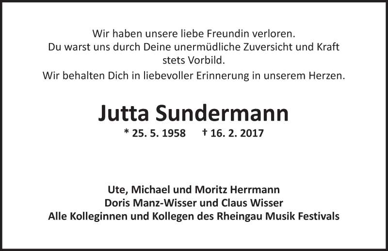 Hier finden Sie alle Traueranzeigen aus der Zeitung, die bisher für Jutta Sundermann erschienen sind. Weitere Traueranzeigen, die in der Zeitung erscheinen, werden hier ebenfalls aufgelistet