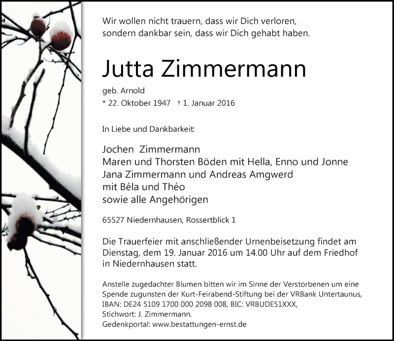 Hier finden Sie alle Traueranzeigen aus der Zeitung, die bisher für Jutta Zimmermann erschienen sind. Weitere Traueranzeigen, die in der Zeitung erscheinen, werden hier ebenfalls aufgelistet