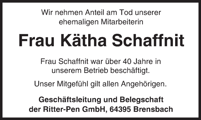 Hier finden Sie alle Traueranzeigen aus der Zeitung, die bisher für Kätha Schaffnit erschienen sind. Weitere Traueranzeigen, die in der Zeitung erscheinen, werden hier ebenfalls aufgelistet