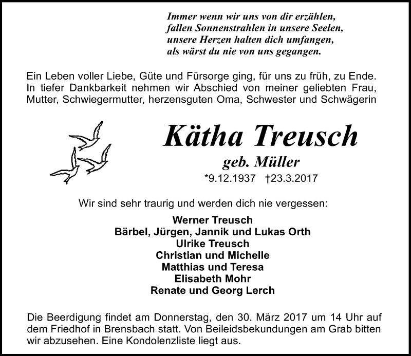 Hier finden Sie alle Traueranzeigen aus der Zeitung, die bisher für Kätha Treusch erschienen sind. Weitere Traueranzeigen, die in der Zeitung erscheinen, werden hier ebenfalls aufgelistet