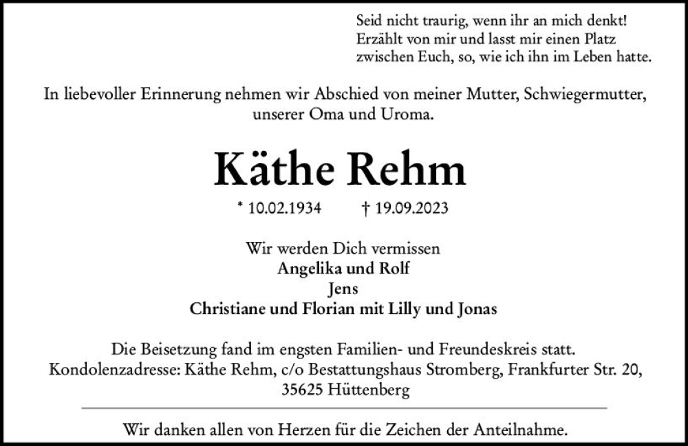 Hier finden Sie alle Traueranzeigen aus der Zeitung, die bisher für Käthe Rehm erschienen sind. Weitere Traueranzeigen, die in der Zeitung erscheinen, werden hier ebenfalls aufgelistet