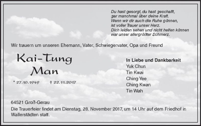 Hier finden Sie alle Traueranzeigen aus der Zeitung, die bisher für Kai-Tung Man erschienen sind. Weitere Traueranzeigen, die in der Zeitung erscheinen, werden hier ebenfalls aufgelistet