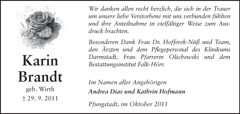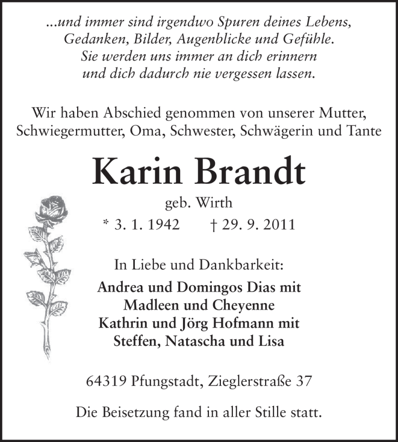 Hier finden Sie alle Traueranzeigen aus der Zeitung, die bisher für Karin Brandt erschienen sind. Weitere Traueranzeigen, die in der Zeitung erscheinen, werden hier ebenfalls aufgelistet