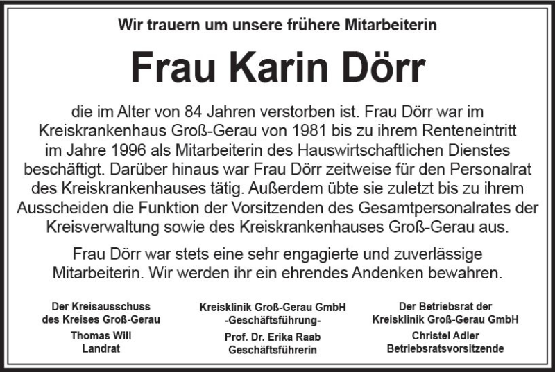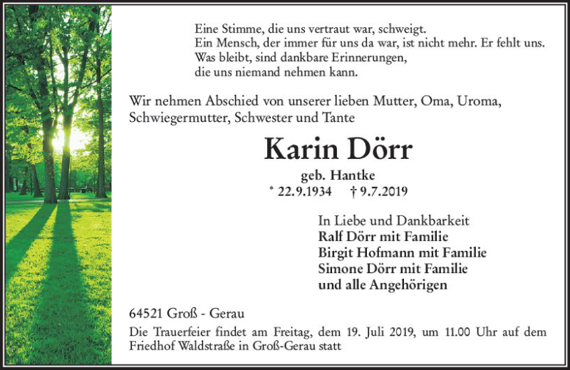 Hier finden Sie alle Traueranzeigen aus der Zeitung, die bisher für Karin Dörr erschienen sind. Weitere Traueranzeigen, die in der Zeitung erscheinen, werden hier ebenfalls aufgelistet