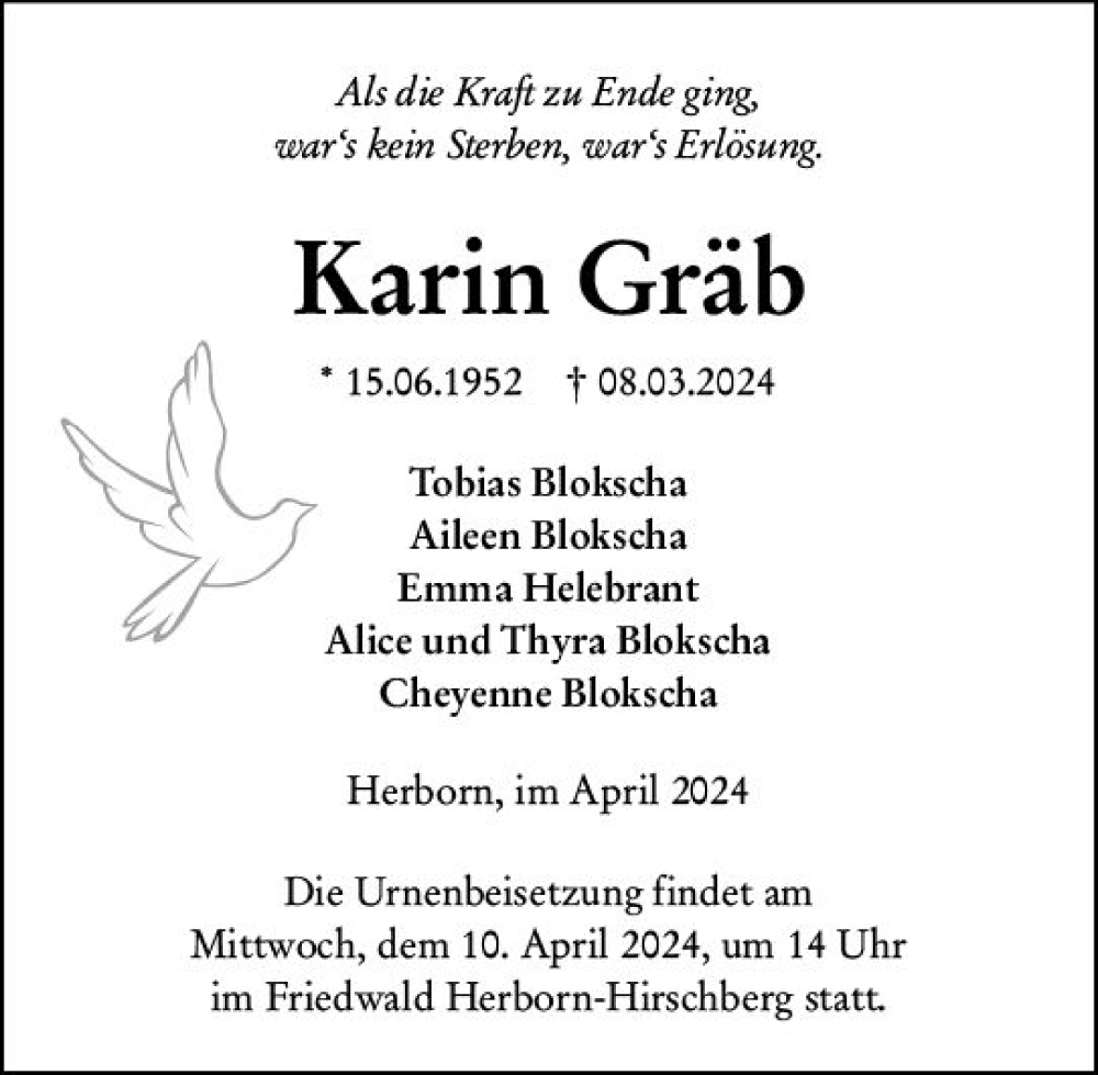 Hier finden Sie alle Traueranzeigen aus der Zeitung, die bisher für Karin Gräb erschienen sind. Weitere Traueranzeigen, die in der Zeitung erscheinen, werden hier ebenfalls aufgelistet