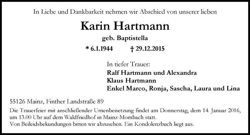 Hier finden Sie alle Traueranzeigen aus der Zeitung, die bisher für Karin Hartmann erschienen sind. Weitere Traueranzeigen, die in der Zeitung erscheinen, werden hier ebenfalls aufgelistet