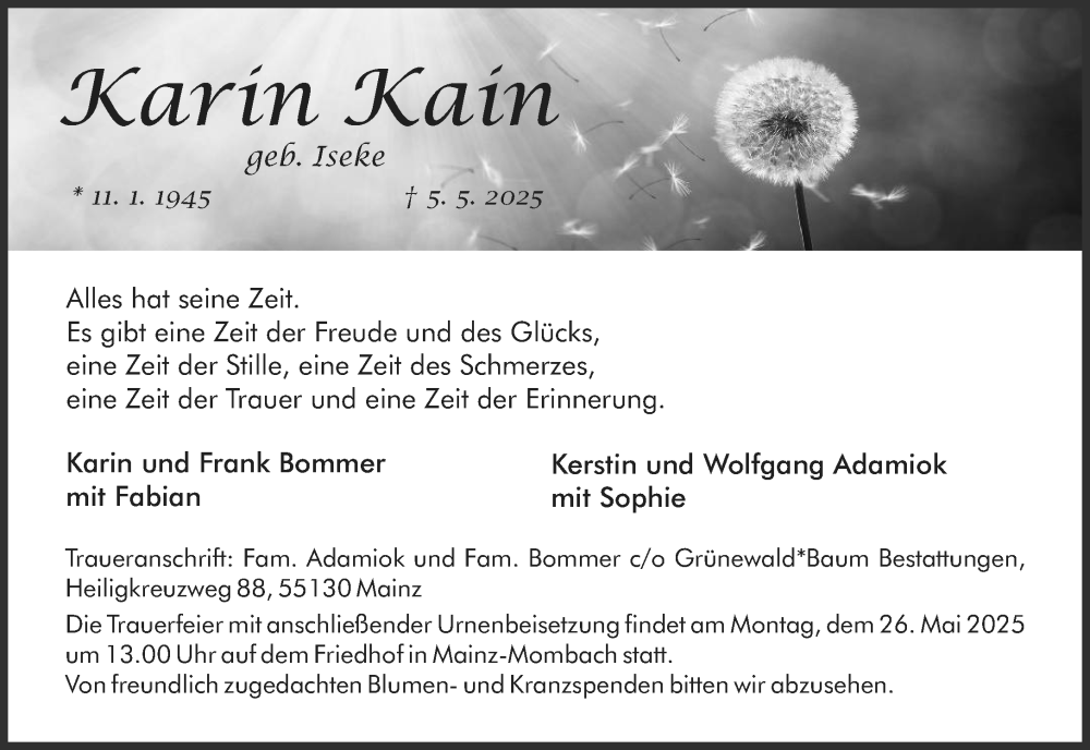 Hier finden Sie alle Traueranzeigen aus der Zeitung, die bisher für Karin Kain erschienen sind. Weitere Traueranzeigen, die in der Zeitung erscheinen, werden hier ebenfalls aufgelistet