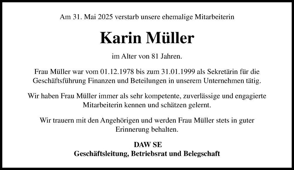Hier finden Sie alle Traueranzeigen aus der Zeitung, die bisher für Karin Müller erschienen sind. Weitere Traueranzeigen, die in der Zeitung erscheinen, werden hier ebenfalls aufgelistet