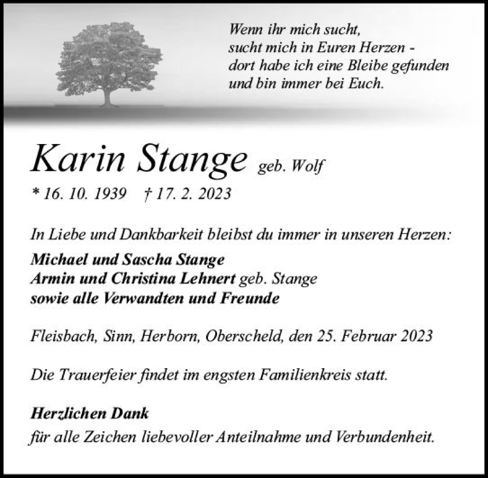 Hier finden Sie alle Traueranzeigen aus der Zeitung, die bisher für Karin Stange erschienen sind. Weitere Traueranzeigen, die in der Zeitung erscheinen, werden hier ebenfalls aufgelistet