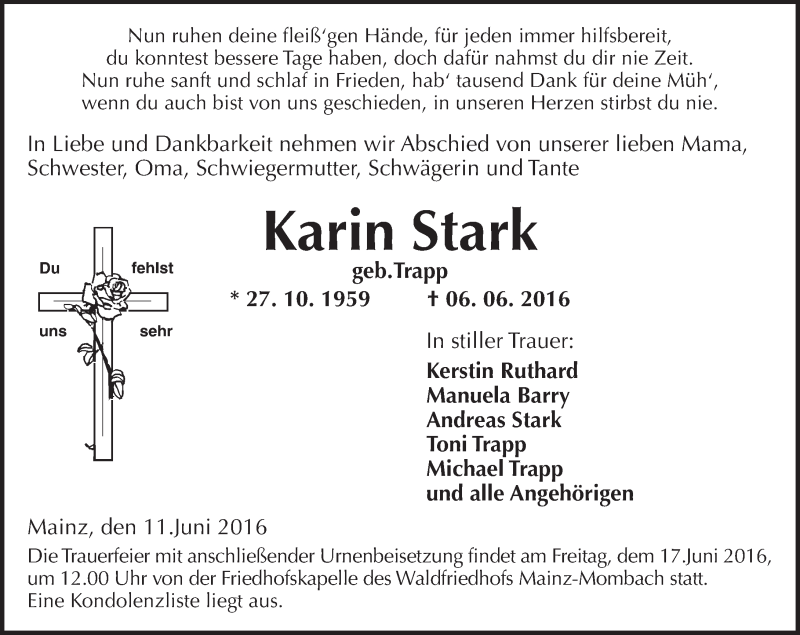 Hier finden Sie alle Traueranzeigen aus der Zeitung, die bisher für Karin Stark erschienen sind. Weitere Traueranzeigen, die in der Zeitung erscheinen, werden hier ebenfalls aufgelistet