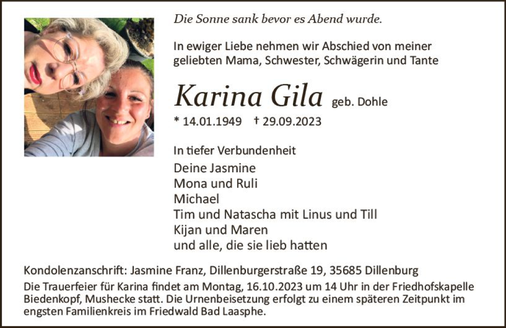 Hier finden Sie alle Traueranzeigen aus der Zeitung, die bisher für Karina Gila erschienen sind. Weitere Traueranzeigen, die in der Zeitung erscheinen, werden hier ebenfalls aufgelistet