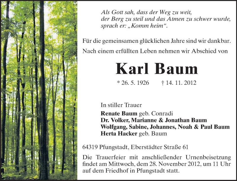 Hier finden Sie alle Traueranzeigen aus der Zeitung, die bisher für Karl Baum erschienen sind. Weitere Traueranzeigen, die in der Zeitung erscheinen, werden hier ebenfalls aufgelistet