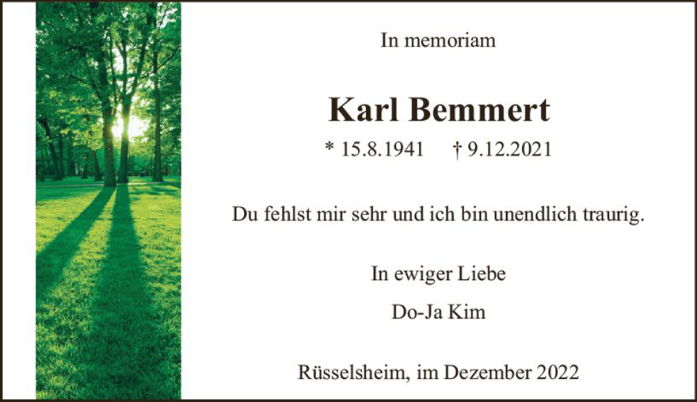 Hier finden Sie alle Traueranzeigen aus der Zeitung, die bisher für Karl Bemmert erschienen sind. Weitere Traueranzeigen, die in der Zeitung erscheinen, werden hier ebenfalls aufgelistet