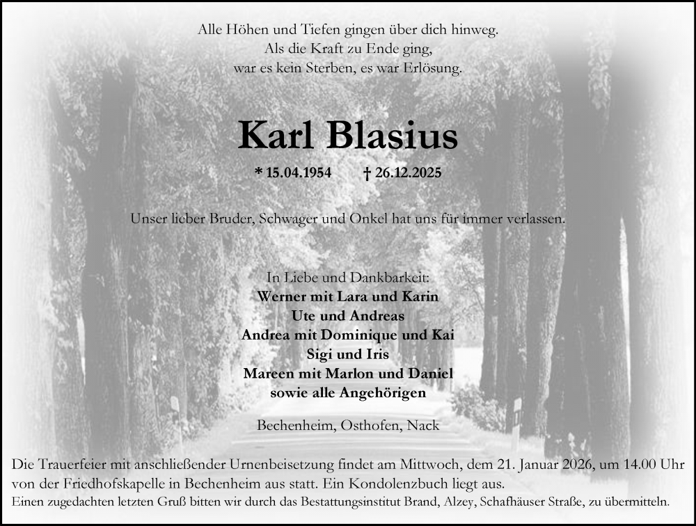 Hier finden Sie alle Traueranzeigen aus der Zeitung, die bisher für Karl Blasius erschienen sind. Weitere Traueranzeigen, die in der Zeitung erscheinen, werden hier ebenfalls aufgelistet