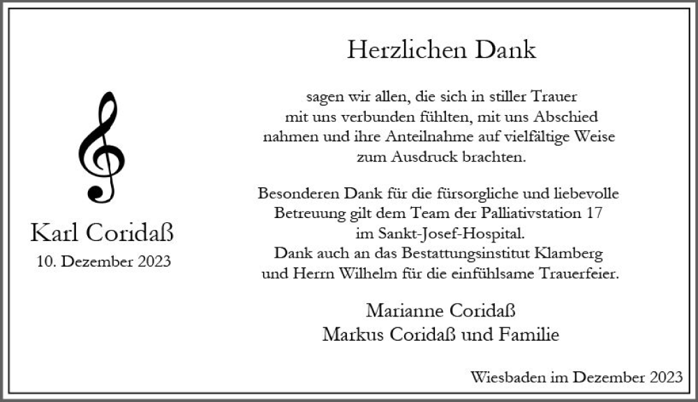 Hier finden Sie alle Traueranzeigen aus der Zeitung, die bisher für Karl Coridaß erschienen sind. Weitere Traueranzeigen, die in der Zeitung erscheinen, werden hier ebenfalls aufgelistet