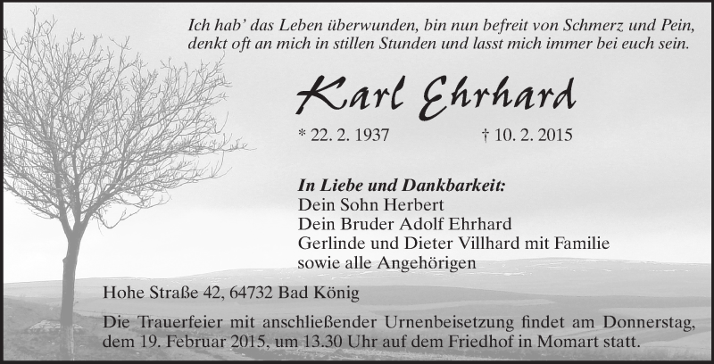 Hier finden Sie alle Traueranzeigen aus der Zeitung, die bisher für Karl Ehrhard erschienen sind. Weitere Traueranzeigen, die in der Zeitung erscheinen, werden hier ebenfalls aufgelistet