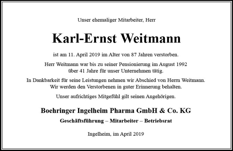 Hier finden Sie alle Traueranzeigen aus der Zeitung, die bisher für Karl-Ernst Weitmann erschienen sind. Weitere Traueranzeigen, die in der Zeitung erscheinen, werden hier ebenfalls aufgelistet