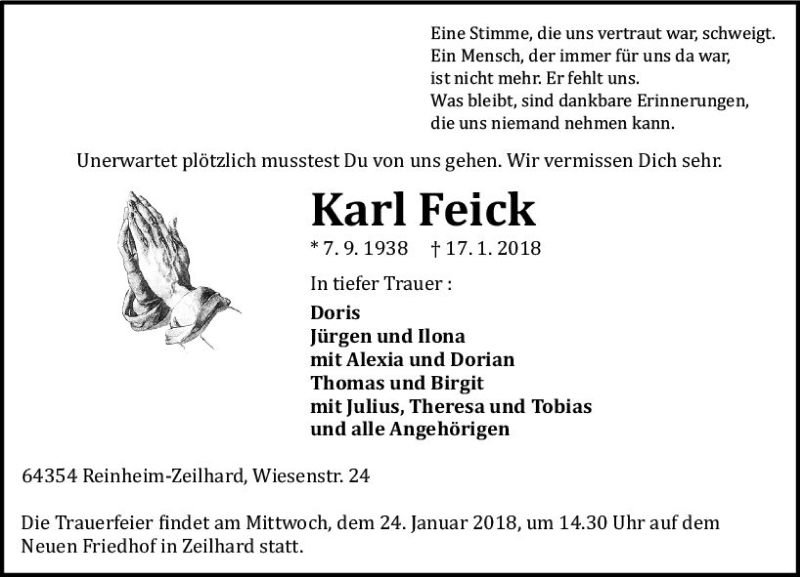 Hier finden Sie alle Traueranzeigen aus der Zeitung, die bisher für Karl Feick erschienen sind. Weitere Traueranzeigen, die in der Zeitung erscheinen, werden hier ebenfalls aufgelistet