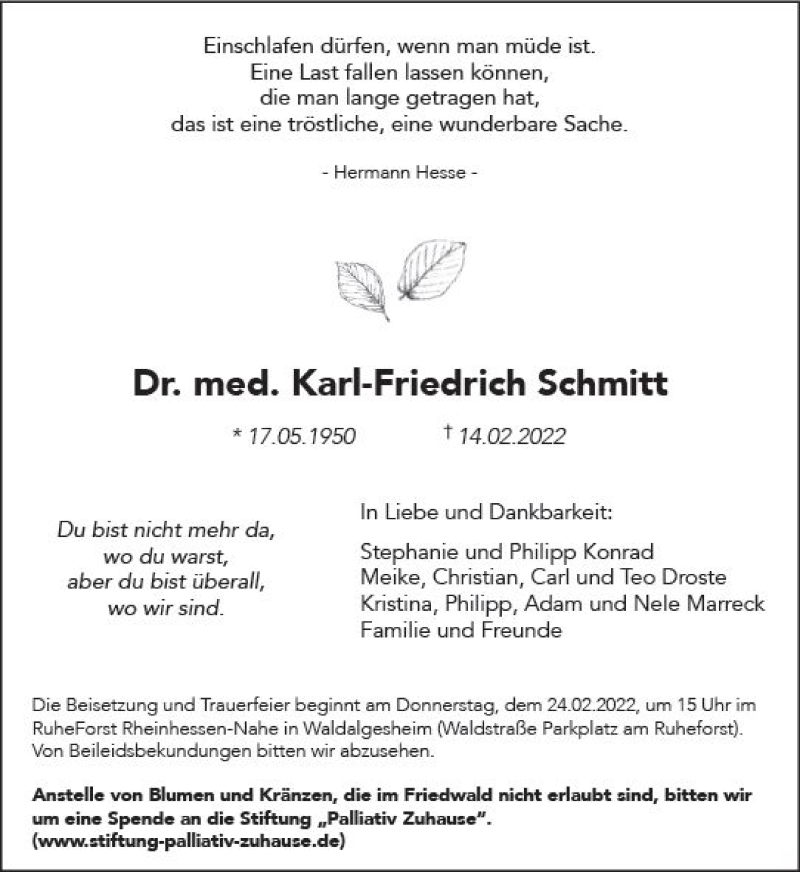 Hier finden Sie alle Traueranzeigen aus der Zeitung, die bisher für Karl-Friedrich Schmitt erschienen sind. Weitere Traueranzeigen, die in der Zeitung erscheinen, werden hier ebenfalls aufgelistet