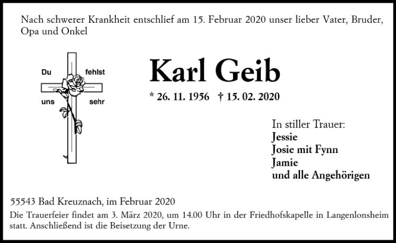 Hier finden Sie alle Traueranzeigen aus der Zeitung, die bisher für Karl Geib erschienen sind. Weitere Traueranzeigen, die in der Zeitung erscheinen, werden hier ebenfalls aufgelistet