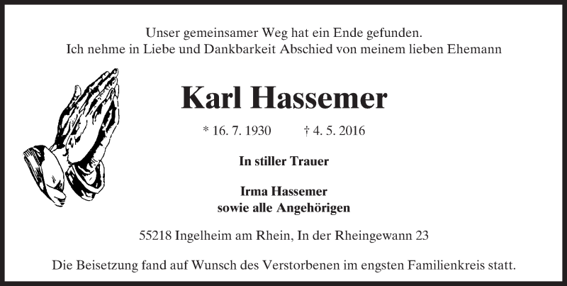 Hier finden Sie alle Traueranzeigen aus der Zeitung, die bisher für Karl Hassemer erschienen sind. Weitere Traueranzeigen, die in der Zeitung erscheinen, werden hier ebenfalls aufgelistet