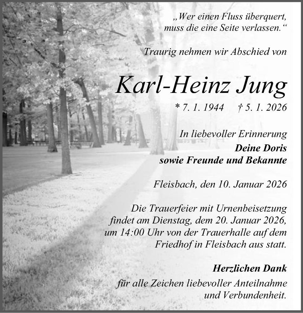 Hier finden Sie alle Traueranzeigen aus der Zeitung, die bisher für Karl-Heinz Jung erschienen sind. Weitere Traueranzeigen, die in der Zeitung erscheinen, werden hier ebenfalls aufgelistet