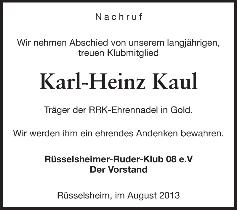 Hier finden Sie alle Traueranzeigen aus der Zeitung, die bisher für Karl-Heinz Kaul erschienen sind. Weitere Traueranzeigen, die in der Zeitung erscheinen, werden hier ebenfalls aufgelistet