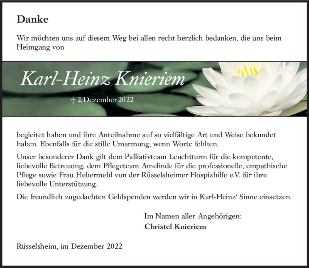 Hier finden Sie alle Traueranzeigen aus der Zeitung, die bisher für Karl-Heinz Knieriem erschienen sind. Weitere Traueranzeigen, die in der Zeitung erscheinen, werden hier ebenfalls aufgelistet