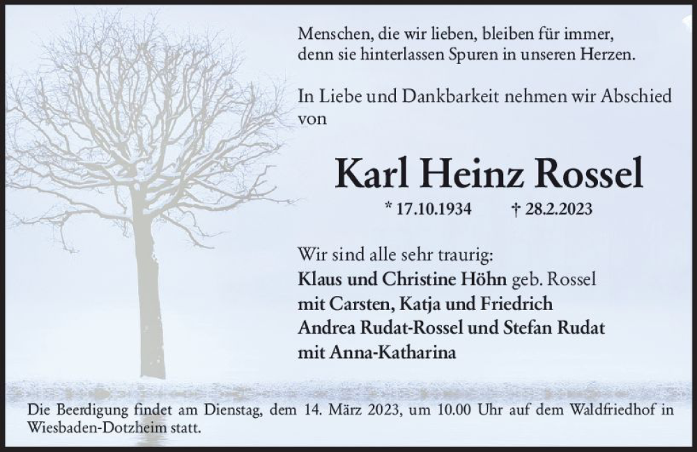 Hier finden Sie alle Traueranzeigen aus der Zeitung, die bisher für Karl Heinz Rossel erschienen sind. Weitere Traueranzeigen, die in der Zeitung erscheinen, werden hier ebenfalls aufgelistet